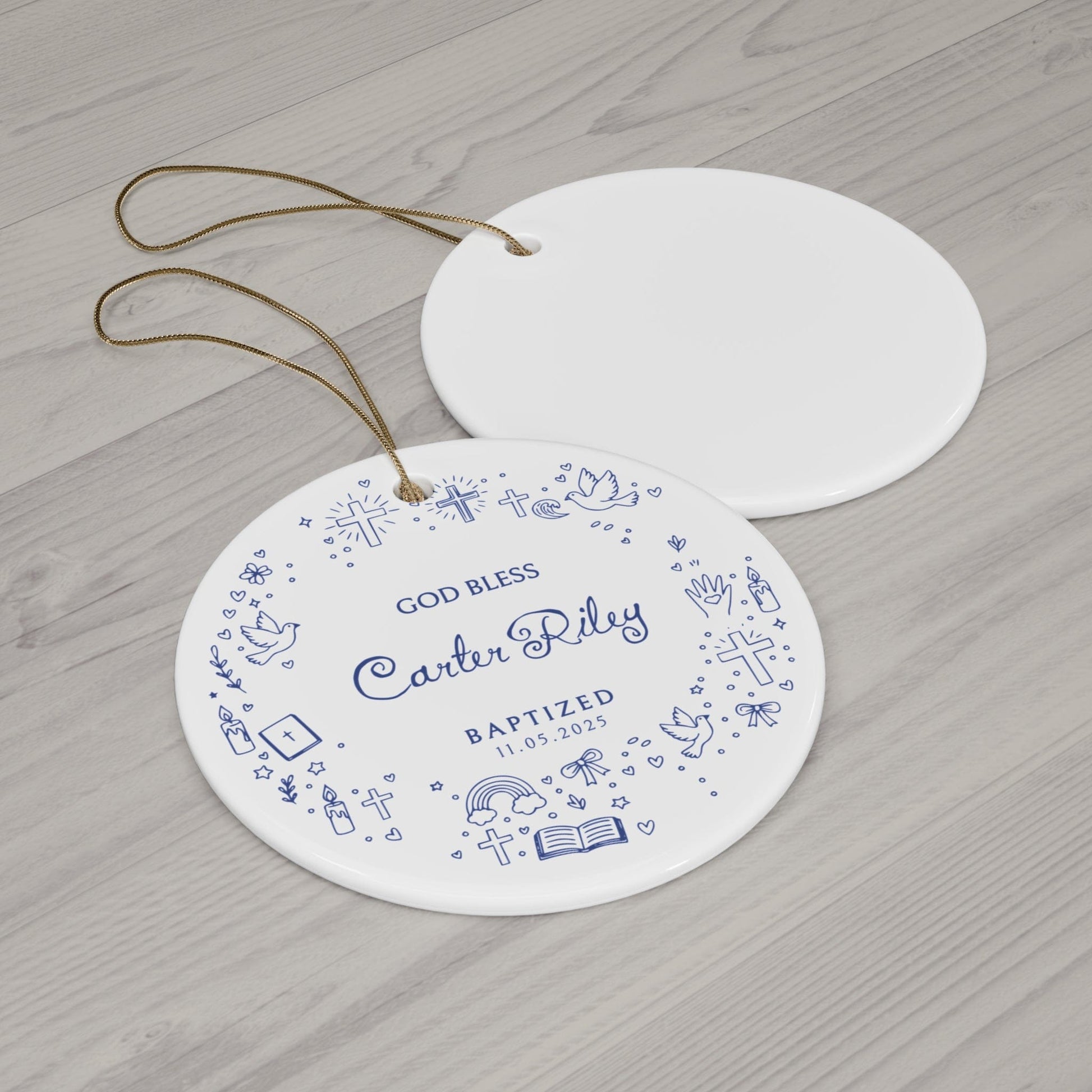 Celebrate a special faith milestone with a personalized baptism ornament, featuring a hand-drawn doodle design in blue. Customize with the child’s name, date, and wording (Baptized or Christened) for a meaningful keepsake gift from family, godparents, or friends.