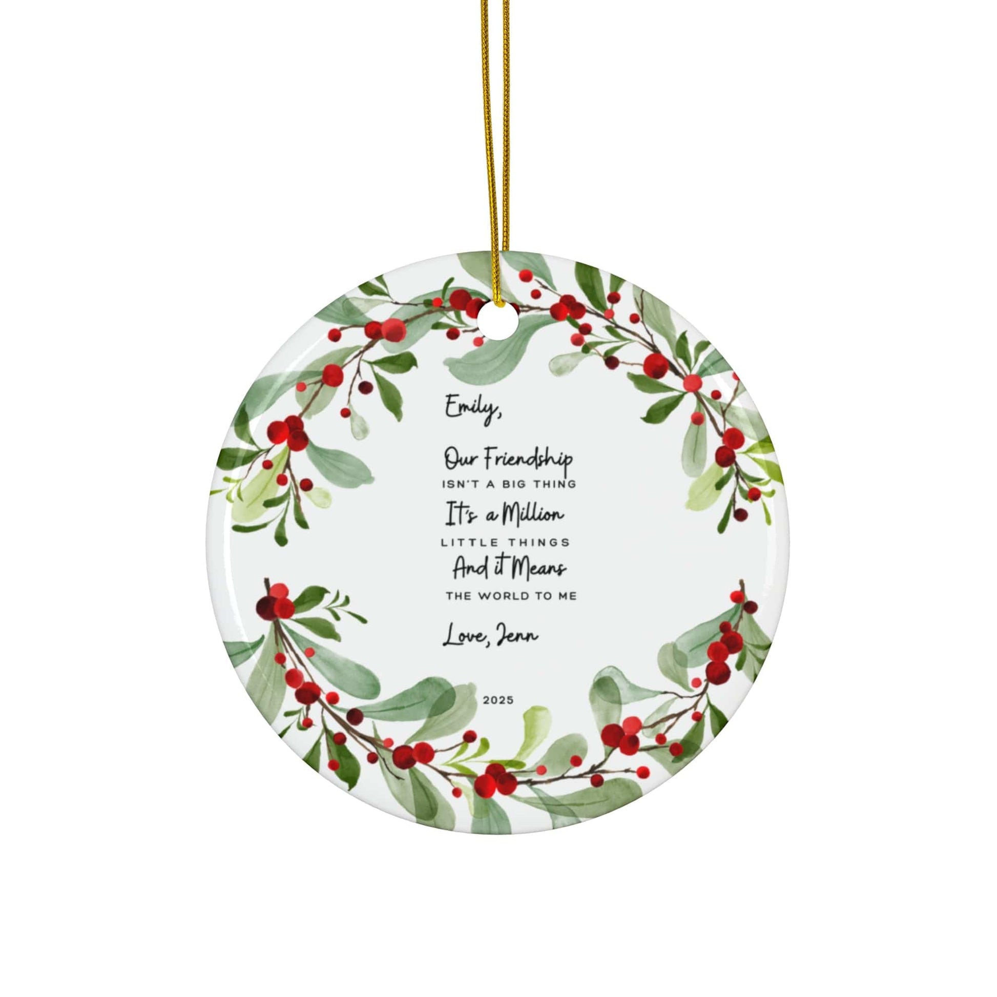 A heartfelt keepsake for your best friend, this personalized ornament features a message that expresses how much their friendship means to you.