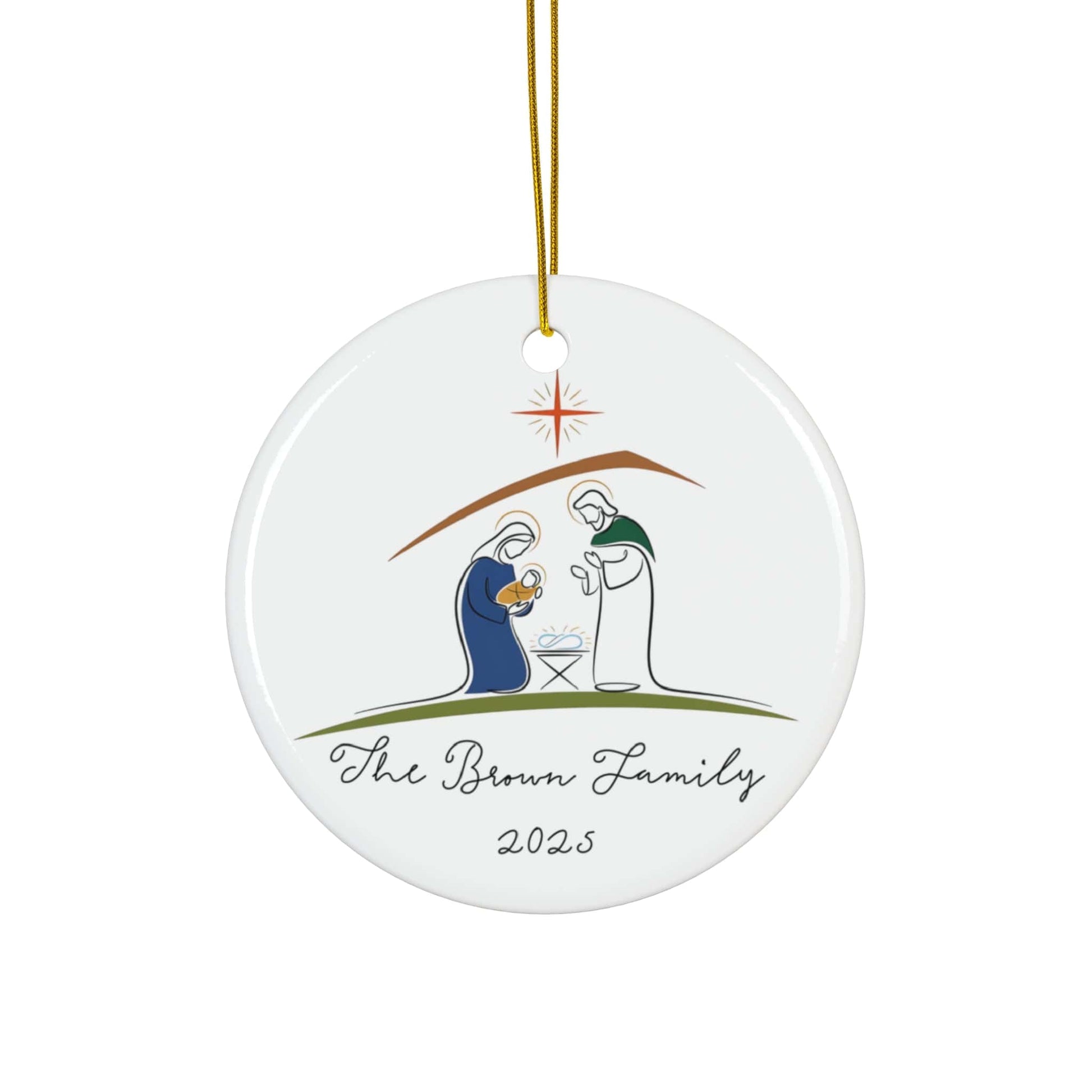 Celebrate the true meaning of Christmas with a personalized nativity ornament featuring your family name and year. Available in six unique designs — from minimalist line art to intricate mosaics — each ceramic ornament is a timeless keepsake and a meaningful gift for families and loved ones.