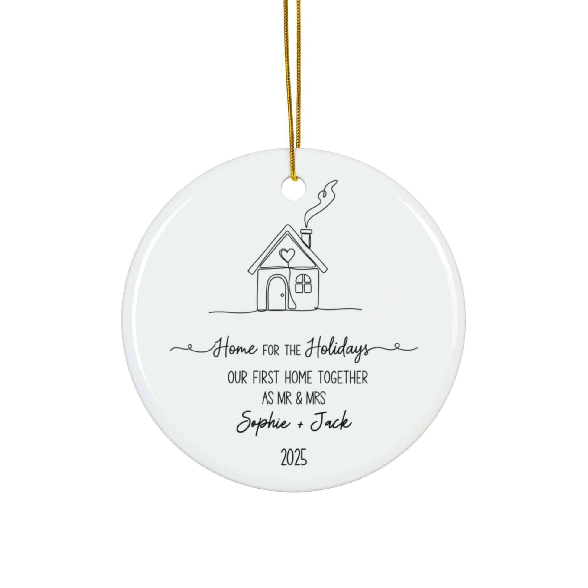 Celebrate your first home together with this sweet personalized ornament. Featuring a cozy house illustration and custom names, it makes a meaningful Christmas gift for newlyweds, couples, or new homeowners.