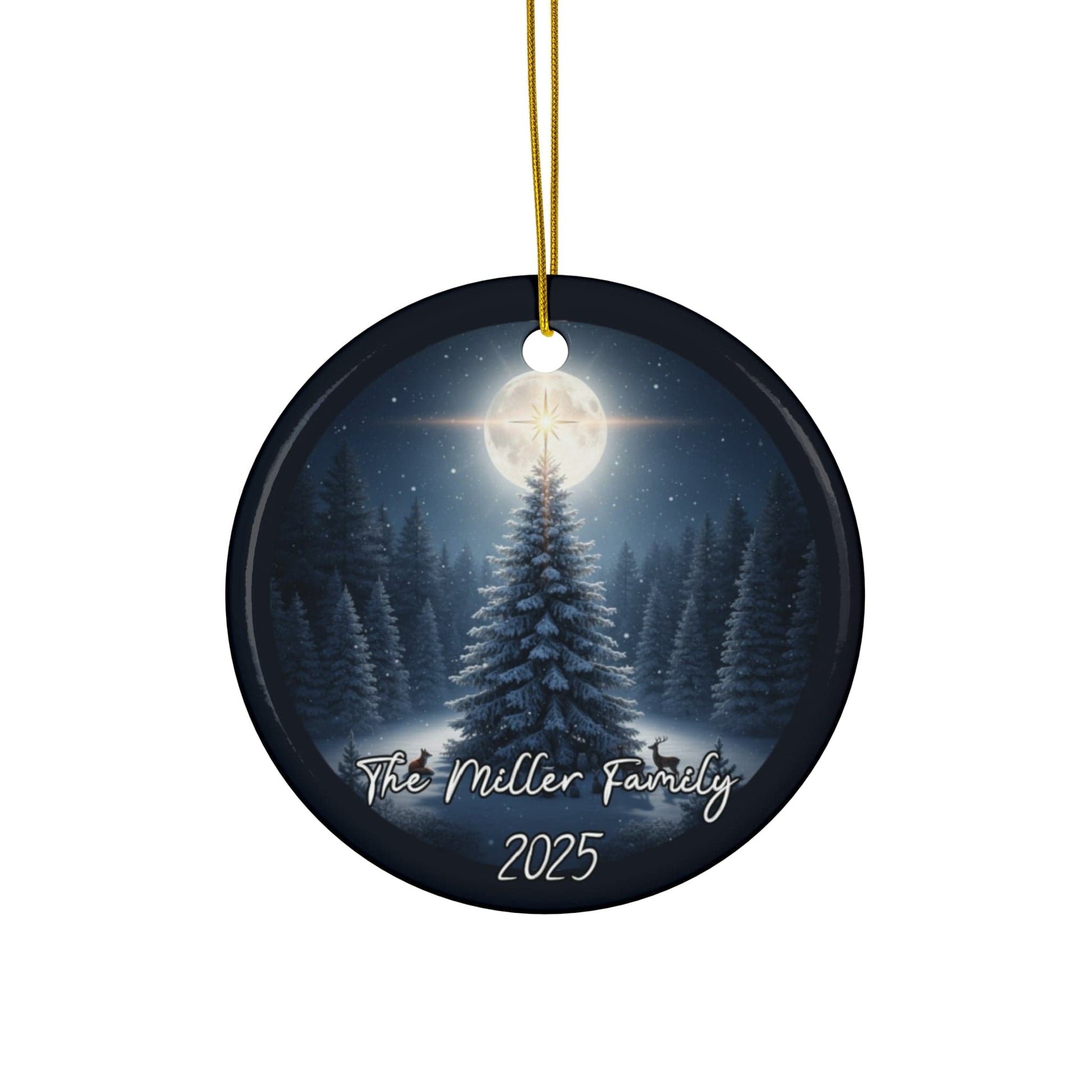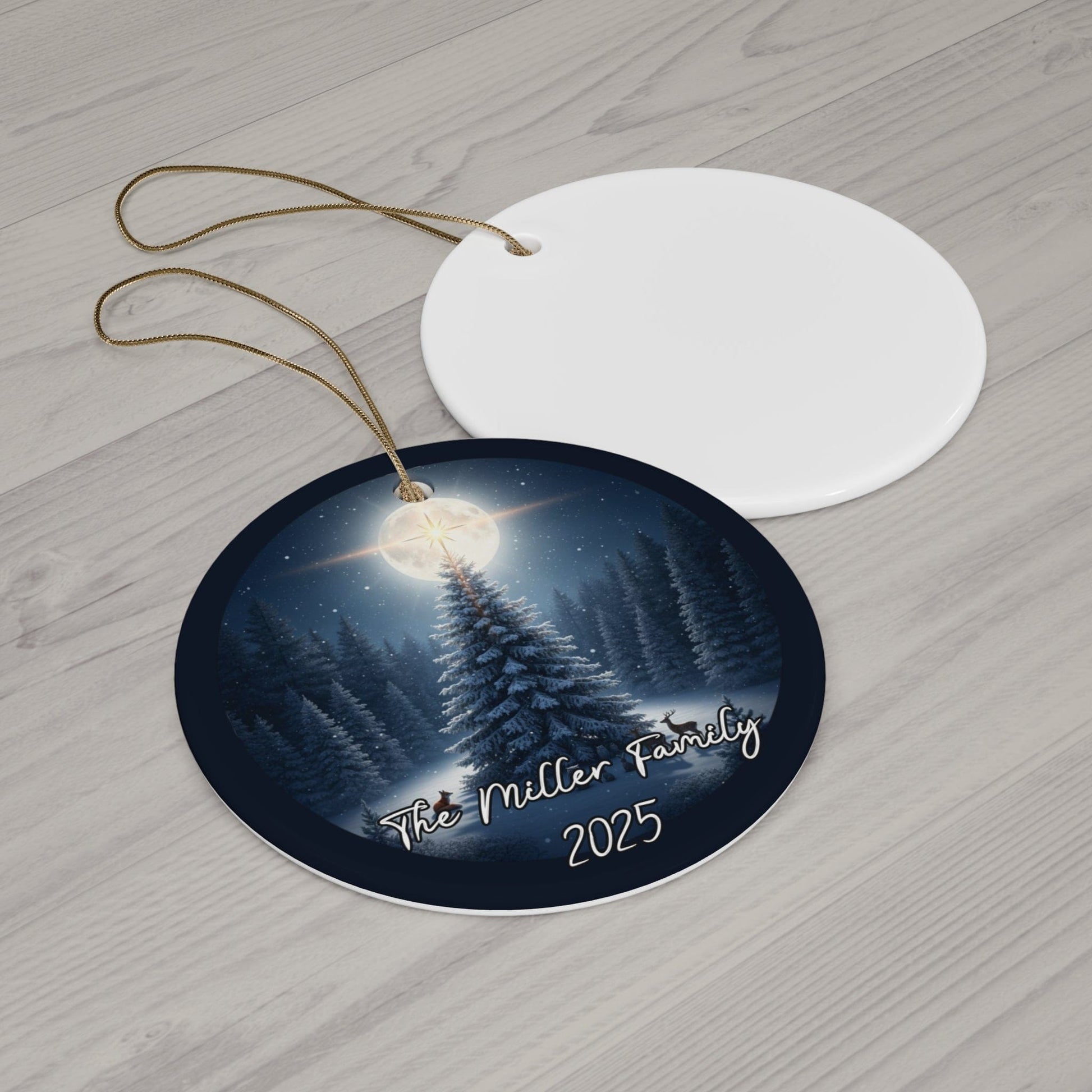 Celebrate your family with this classic ceramic Christmas ornament, personalized with your family name and year. Each piece is custom-printed with vibrant detail and finished with a timeless holiday look. A keepsake you’ll treasure for years—or the perfect gift for another family’s tree.