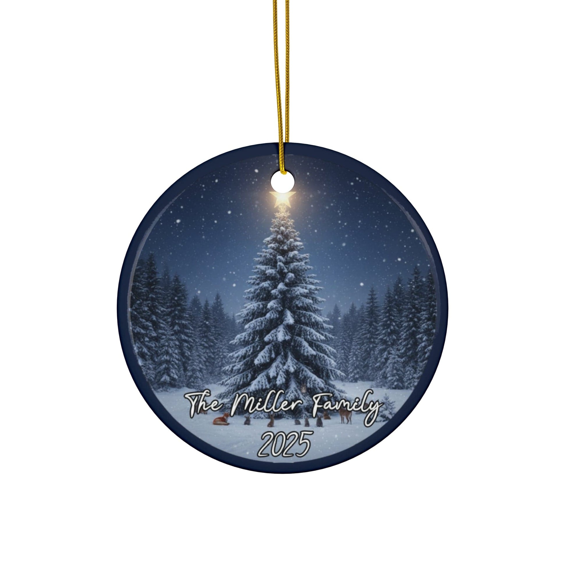 Celebrate your family with this classic ceramic Christmas ornament, personalized with your family name and year. Each piece is custom-printed with vibrant detail and finished with a timeless holiday look. A keepsake you’ll treasure for years—or the perfect gift for another family’s tree.